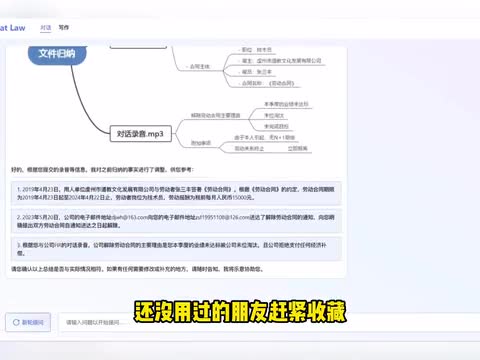 chat到不仅集成了海量法律文献。案例法规等数据资源,还具备强大的法律文本理解和生成能力,同时支持用户上传文件、录音等法律材料,并能帮助用户归纳和分析这些材料,生成可视化导图、图表等。