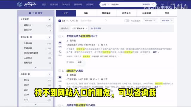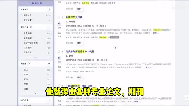 比如我们查找新能源车,它就弹出各种专业论文、期刊、专利等供你查看。
