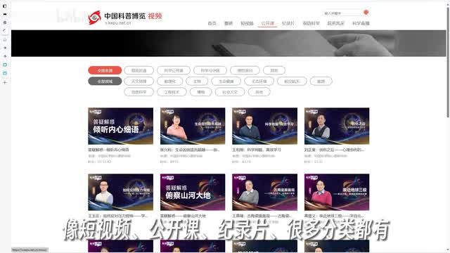 四、中国科普博览里面都是中科院的科学家录制的授课视频,像短视频、公开课、纪录片很多分类都有,里面包含了很多领域,网站的课程质量应该就不用我多说了,最主要的是完全免费试用。