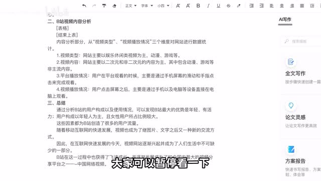 而且更牛逼的是你完全可以脱离鼠标,仅使用键盘进行指令操作。比如我们在文章中输入写一篇关于哔哩哔哩平台用户分析的文章,点击回车,它就会生成一篇完整的文章。大家可以暂停看一下,几乎没有什么需要修改的地方,直接拿来用就可以了,有更高要求的同学可以直接在里面进行修改,例如将上一段进行改写,还能检测错别字和文章的流畅性。写完选择右侧的下载文档就起火了。