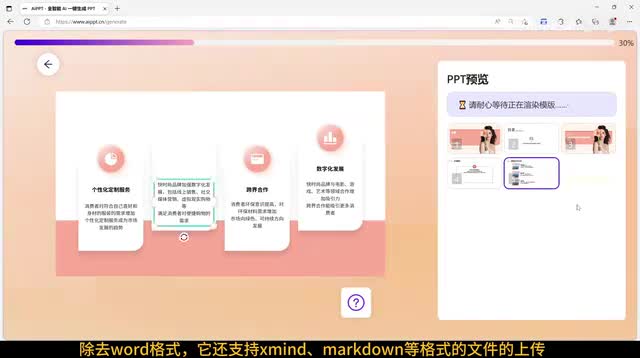 演演示的流程一键生成p p t。除去word格式,它还支持x mind markdown等格式的文件的上传。