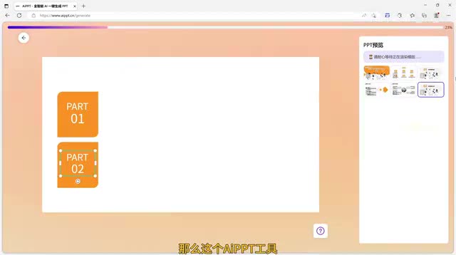 选择好后,点击这里即可生成p p t生成速度非常快,品质和时间点是人工的几十倍。你可以根据需要对生成的p p t进行形式和内容上的微调编辑,然后导出为p p t文件,一个p p t的制作就完成了。