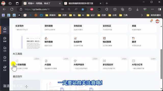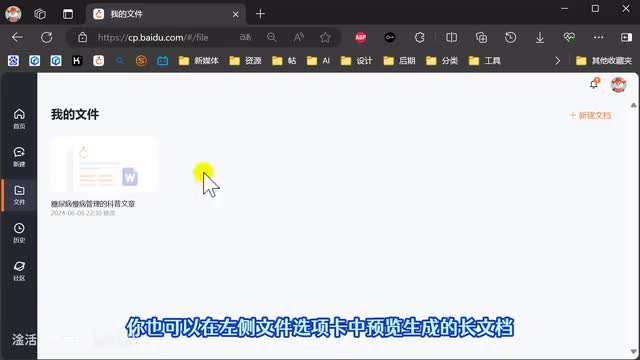 单击下方的生成长文按钮即可。一般需要五至十分钟。完成后,系统会发送通知给你。你也可以在左侧文件选项卡中预览生成的长文档。接着。我们进入文档。可以对生成的文档进行在线编辑。就和我们平时编辑word差不多。注意。