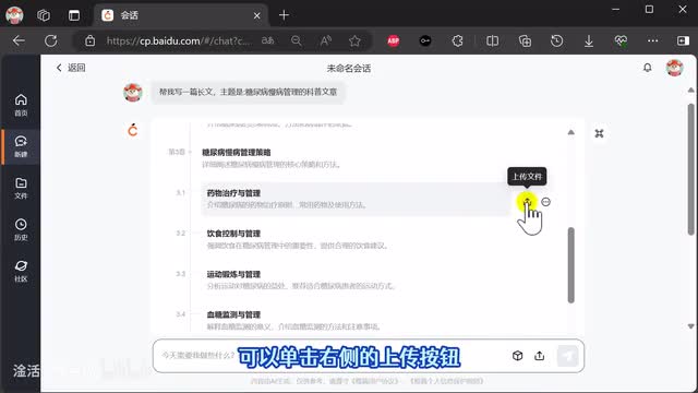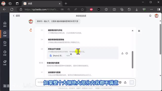我们可以在下方输入文章主题的提示词。因为只是测试,我就输入个简单的提示词。让他生成一篇关于糖尿病慢病管理的科普文章。单击右侧的发送按钮。成片会开始生成一份基于上述主题的提纲。支持张标题和节标题两个层级。但是通常。我们对这份提纲会有一些不满意的地方。所以。