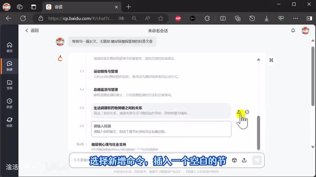 下一步,我们需要对其进行手工修改。例如,我要在糖尿病慢病管理策略这章加上一节。可以单击截标题右侧的三个点标记的菜单按钮。选择新增命令,插入一个空白的节里。输入我想添加的截标题和内容相关的提示词。后续成片会据此生成内容。同理。如果选中的是张标题来新增。则会新增一个空白的章。