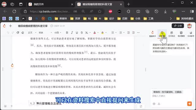 我们单击右侧的智能助手。可以激活一些新的功能。例如。我们在预览文档的过程中。突然觉得想增加一些内容。可以在资料搜索中直接提问来生成。并将其复制粘贴到原文中。另外,全文校对功能。可以修改文章语法错误并优化句子结构。