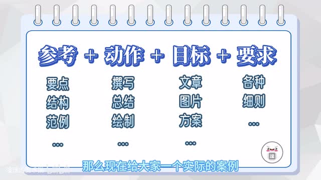 目标是指动作的对象,比如文章、图片、视频、方案。简单的说,动作是谓语,目标则是宾语。最后要求是指生成内容时需要遵循的各种细节要求。