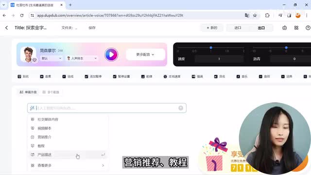 首先选中需要调整的文案,点击速度,文案旁边就出现了不同倍数,我选择零点九五倍减慢一点。比如我想强调是谁这两个字,先选中,然后点击强调就可以了。同样方法还可以为文案添加音乐和音效。文案编辑完成后,点击右上角输出按钮,这里翻译有点出错,翻译成了出口,选择音频格式,然后确认。弹出的对话框会告诉我们文案一共一千零七十五个字符,强调了一次速度,调整了两次,一共花费一点三二个积分,生成的语音预计是一分零六秒。