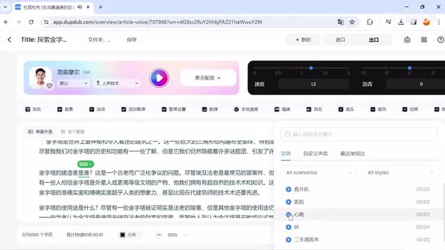 大家好。今天,我们将带您来探索古埃及金字塔。这些令人惊叹的建筑是古代世界的奇迹之一。首先我们来介绍最著名的金字塔,胡夫金字塔。ok, 直接就按我前面生成的文案来进行配音了,可以更换在试听,直到选中你想要的配音员。