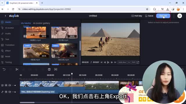 首先上传test文本,然后就在audio这里点击,choose a voice over and convert, 选择配音员,把文本转换为配音员,演示audio gallery,这里是音乐和音响。因为我们在前面已经做好了,音频就不重复了。ok我们点击右上角export导出视频,等待大概一分钟,我们来看看成果。神秘的金字塔之谜。金字塔是世界上最神秘和令人着迷的建筑之一,这些巨大的三角形结构遍布全球,特别是埃及的吉萨高原上的金字塔最为著名。