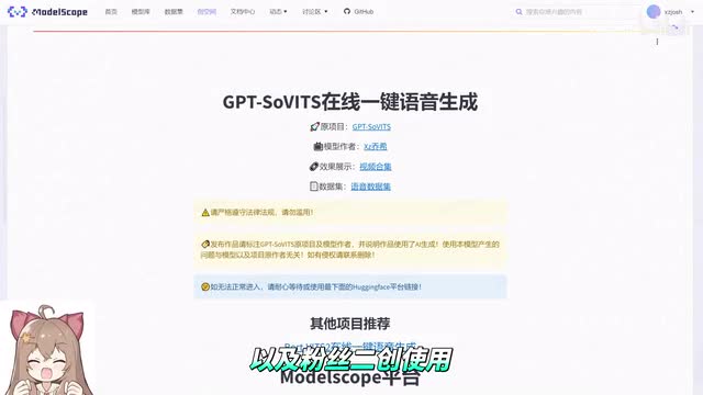 操作完成之后点击生成就好了,需要耐心等待一会儿,因为每一次的生成结果都是随机的,如果效果不好,可以多生成几次,也可以更换参考音频再试试。本模型仅供技术展示以及粉丝二创使用,使用时请严格遵守法律法规,不得损害说话人的形象,关注up主即可自动获取链接,后续还会持续更新更多语音模型,请持续关注哦,谢谢大家。