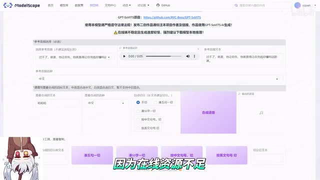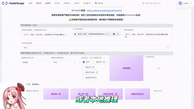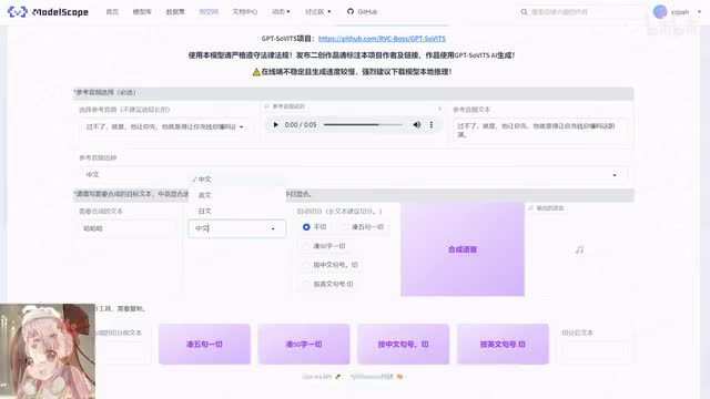 选择好参考音频之后,在这里输入你想要生成的内容,然后再选择对应的语言。目前支持中音以及日音的混合生成,不过摩大平台对日语有限制。