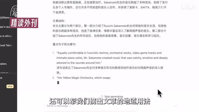 那试题的电子版可以找我要。第三是可以用它来精读外刊,让它去生成文章的摘要,分析文章的结构,理解文章里面的重点句子,还有长难句,还可以帮我们摘出文章的地道用法。反正就是阅读过程里啊,你遇到什么细节都可以直接去问他。那你如果懒得去找材料,那还可以直接让他去帮你找你感兴趣的外刊。