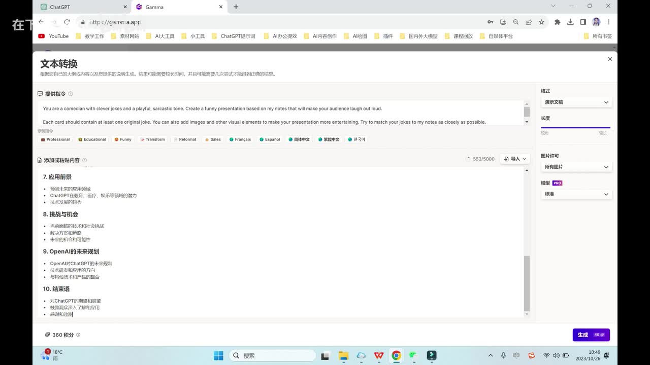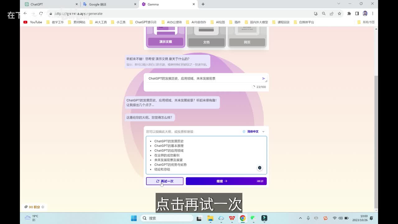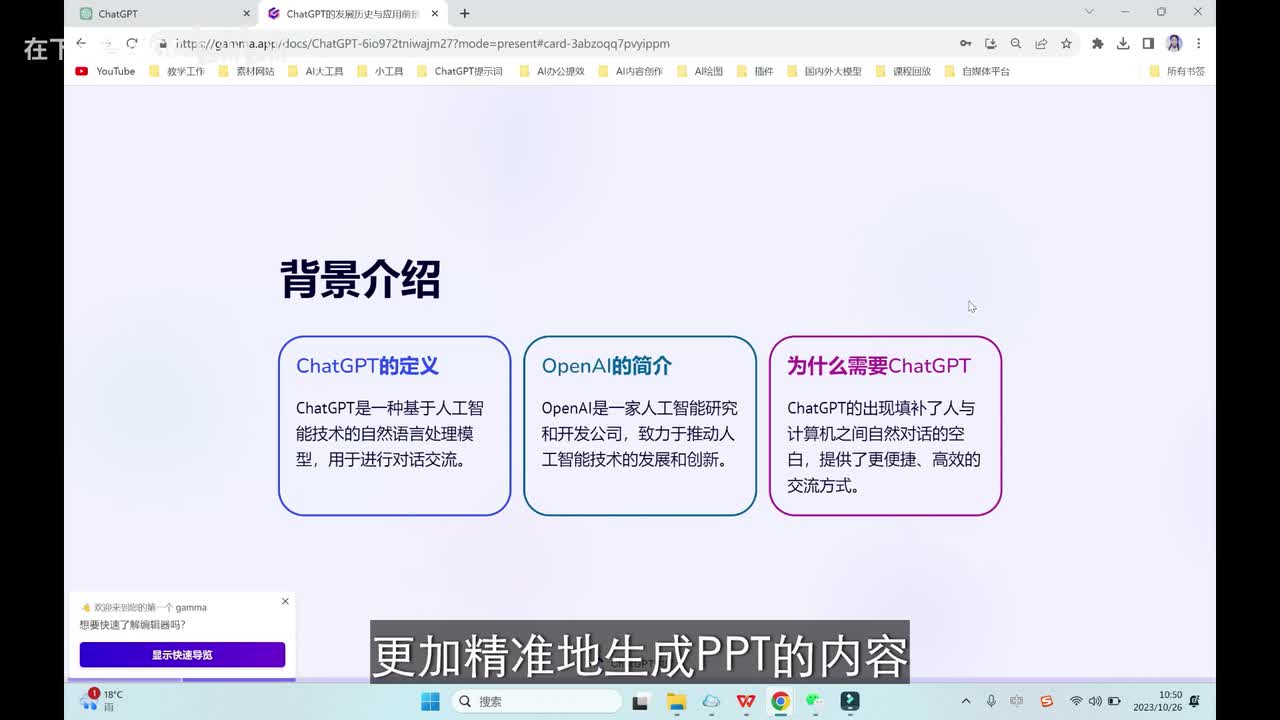 另外呢我们也可以通过chat g p t让它生成大纲,然后将大刚丢给伽马这个地方,我们给他提同样的一个需求,让他帮我们生成关于chat g p t。发展历史以及应用前景的一个设计大纲。好了,现在它已经根据我们的需求生成了十个部分的大纲。我们接下来呢只需要将生成的大纲复制到Gamma里面去。