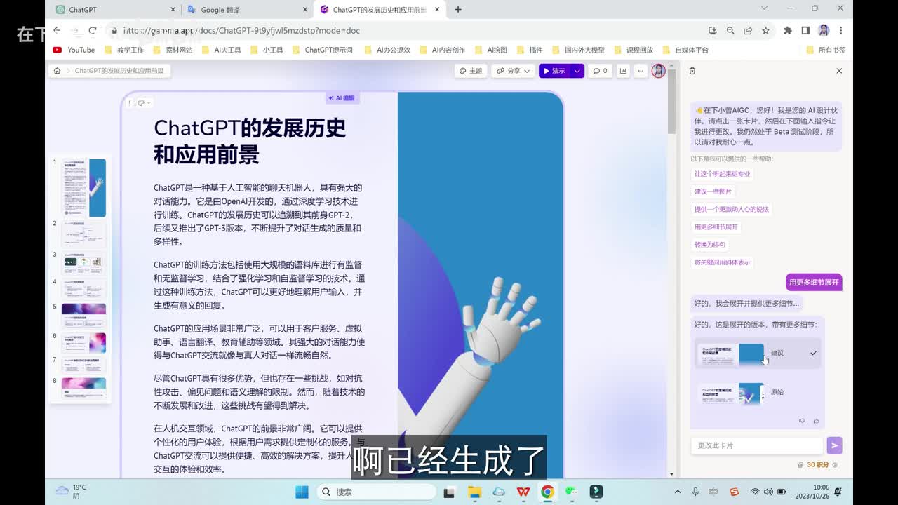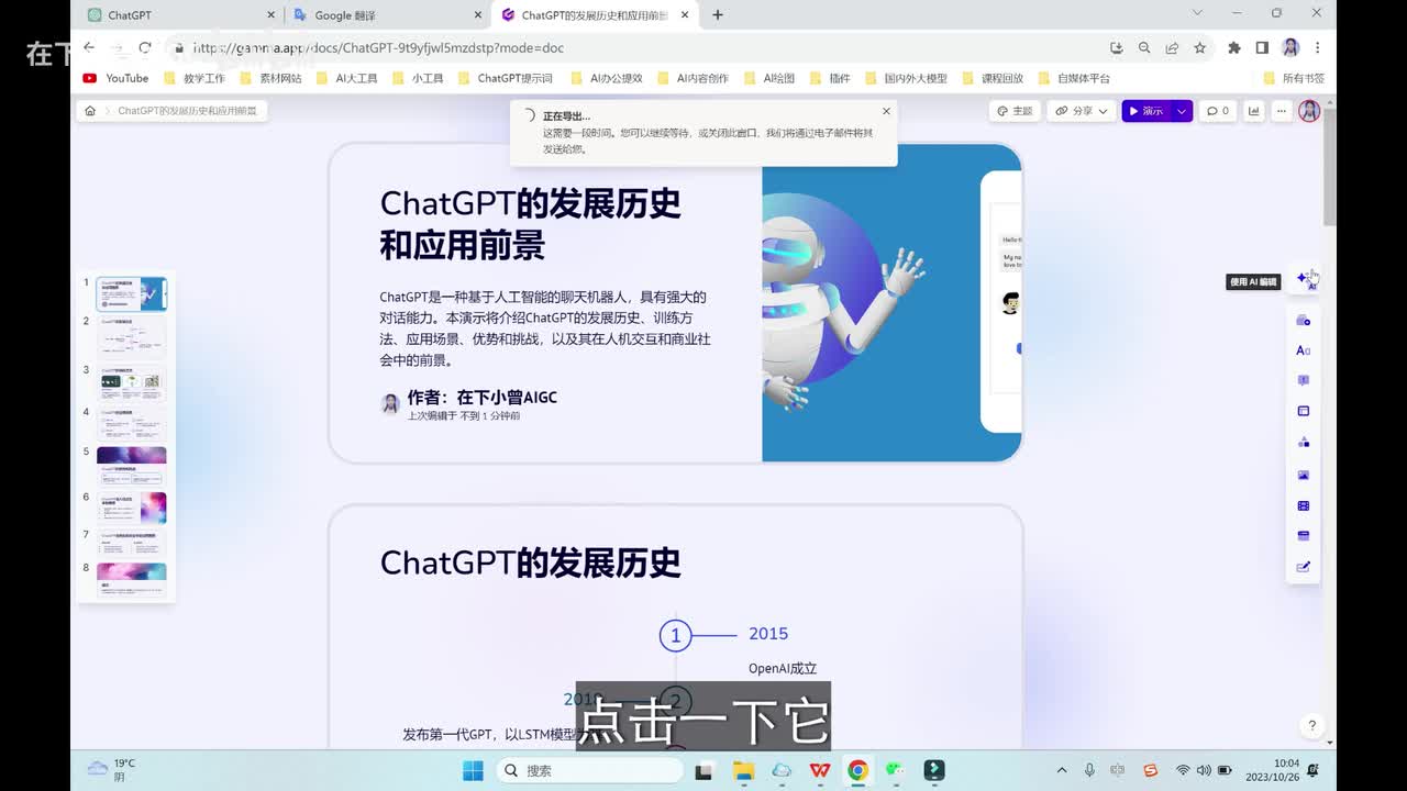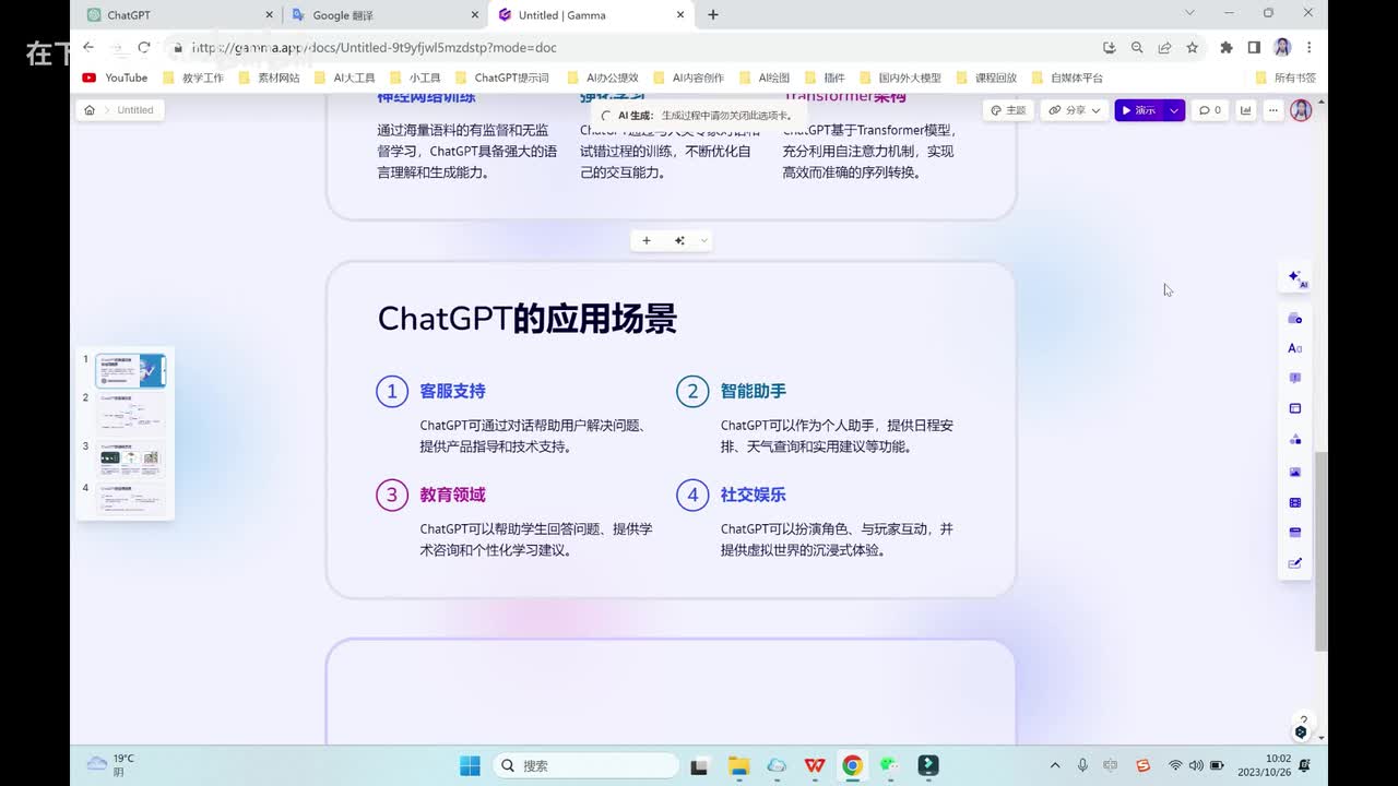 接下来就可以看到它生成的这个过程。通过chat g p t来制作p p t大纲的话,能够帮助我们更加精准的生成p p t的内容,效果也更好。大家可以下来尝试一下。好啦,今天的分享就先到这个地方了。
