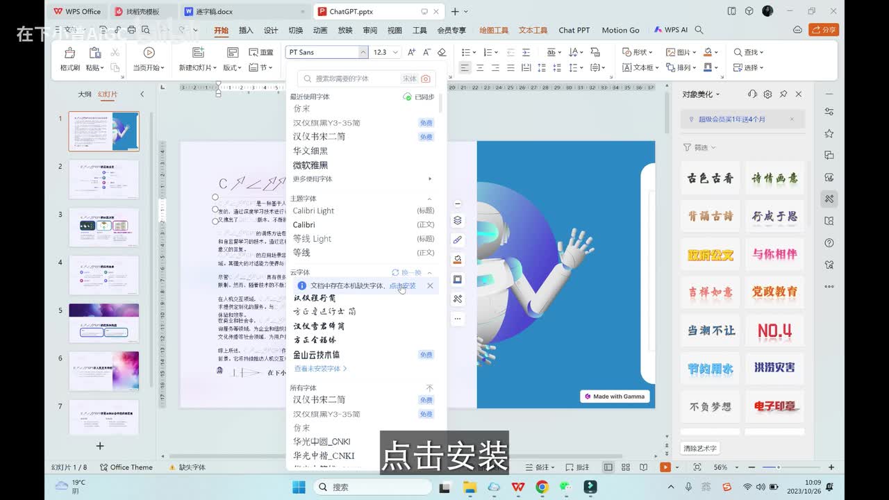 进来之后呢,大家会发现有一些字体丢失了,选择在开始选项卡这个地方去给它进行字体的替换。点击安装。应选择本地字体替换。替换字体,那大家看到就可以了。