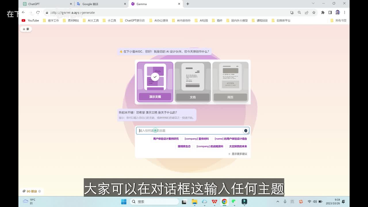 我这里呢有一个帮助大家无限次获取使用次数的方法,感兴趣的小伙伴呢可以给我点赞评论,在后台私信我哟。点击演示文稿。大家可以在对话框这儿输入任何主题,中文都可以。我让他帮我生成一个关于chat g p t的发展历史、应用领域以及未来发展前景的大纲。