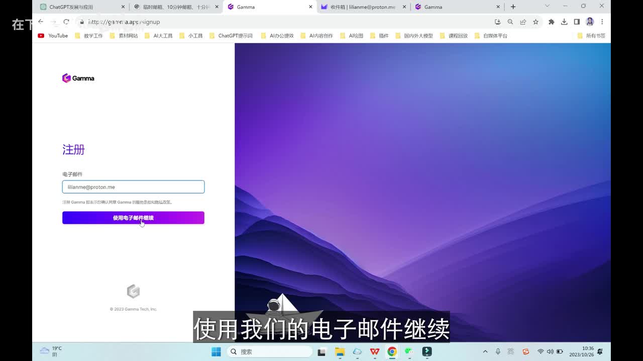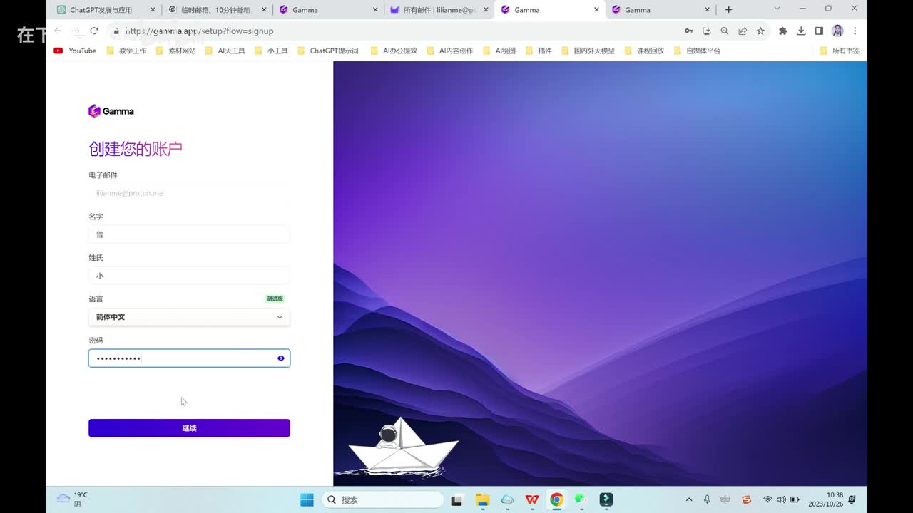 接下来呢我就教大家如何注册Gamma,我们点击注册。输入邮箱。使用我们的电子邮件继续。接下来需要在邮箱里面确认收到的电子邮件,确认之后呢需要我们输入名字和姓氏。
