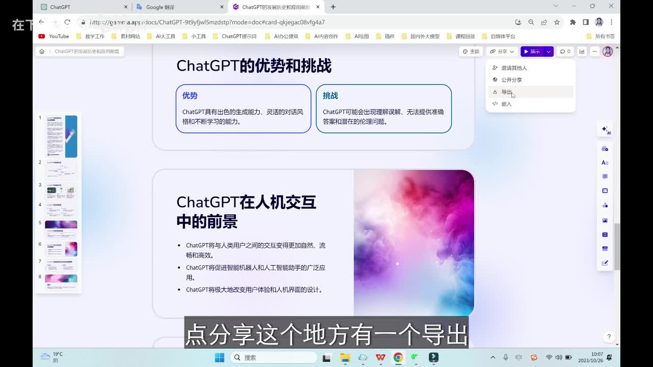 你也可以让他去建议一些图片,他就会帮你自动去寻找跟主题相关的一些图。如果大家要下载的话,点分享这个地方有一个导出,这有两个格式供大家选择,可以选择p d f,也可以选择p p t。那我们点击导出。我们打开文件。