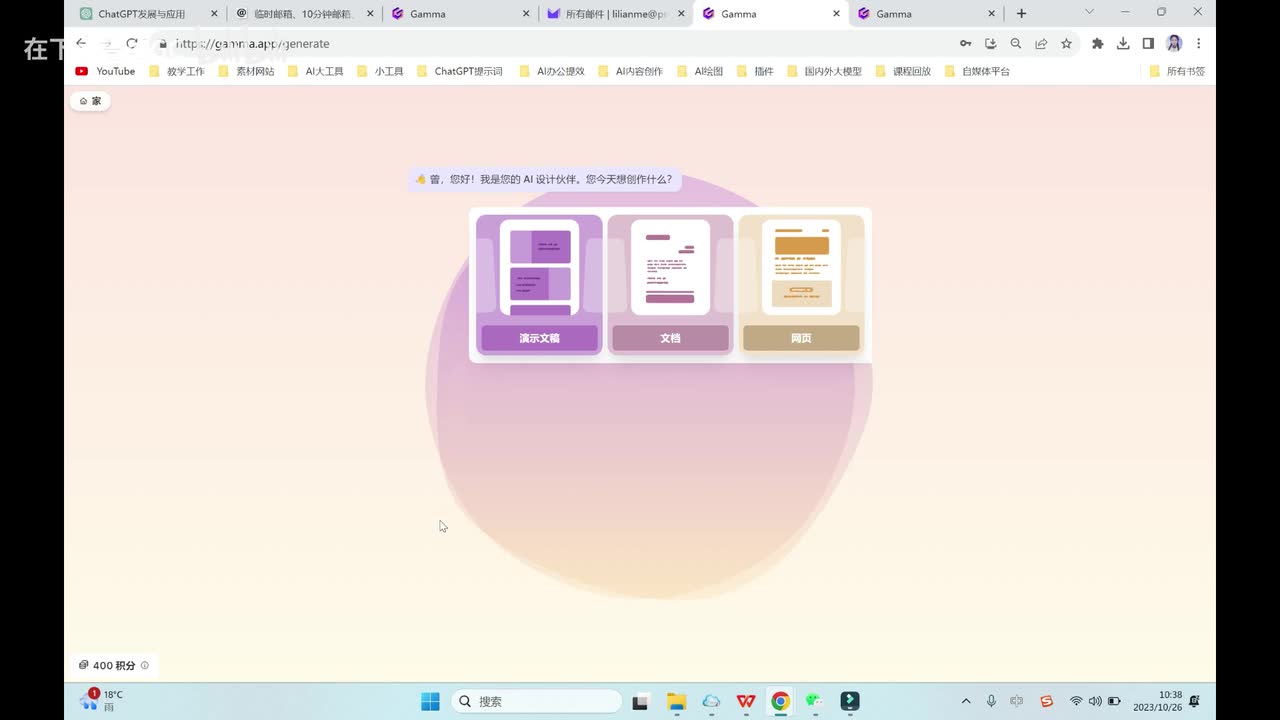 接下来就来到我们的主界面啦。大家需要注意,每一个账号呢官方是给了四百积分。每做一个p p t就要消耗四十个积分。如果你需要a i机器人服务的话,它还会消耗额外的一些积分。