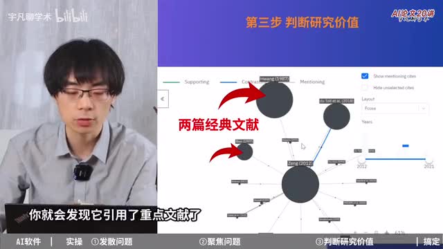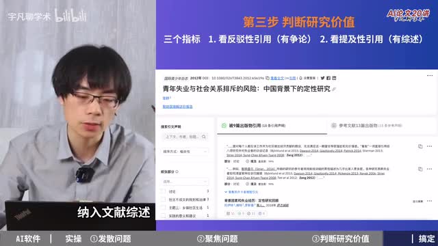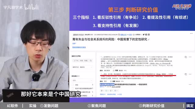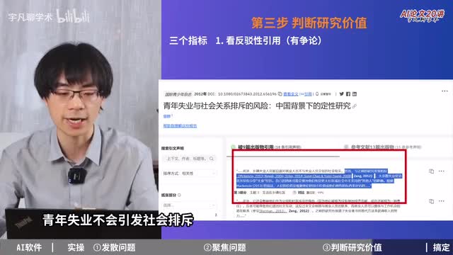 好,那我们就决定如果我接下来我就只在专门聚焦在一点啊,我专门再来聚焦说哎这个青年失业的对社会网络社会支持有什么影响,然后进一步怎么又影响了你的社会排斥。假如我来再聚焦到这一点,来专门写一张我要来怎么做,到底值不值得研究呢?哎,我就会进入第三步了,判断研究的价值。怎么判断呢?当然了,你得来阅读这个领域的文献啊,比方说像刚才说的研究青年失业怎么通过社会网络来影响它的社会排斥。哎,这里我就来选中这篇文献啊,你看到他这篇文献是涉及到什么?是二零一二年复旦大学研究的,就是研究我们中国议题哦,对不对?那你把涉及到这个这个领域的文献,这个议题的文献都拿来找来读一读不就可以了吗?那好,我现在来点击这个文献啊,你会发现什么呢?他立马告诉你关于这一篇复旦大学老师这篇研究有多少次被引用啊,这里有大概十几次,对不对?他甚至围绕这一篇文献给你提供了一个可视化的网络。哎,它不仅给你看到说后来哪些学者在引用这篇文献,而且能看到这篇文献引用了哪些早期经典的文献。