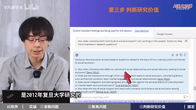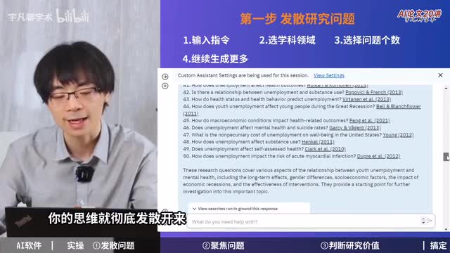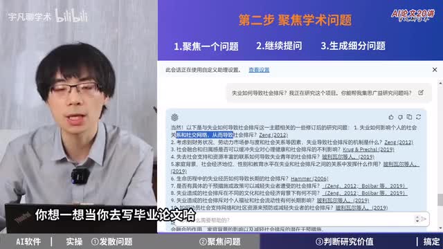 我来问他说这个青年失业是怎么影响社会排斥的啊,我正在做这个研究项目,能够再帮我开开脑洞吗?哎,所以能看到什么?他一下给我生成了十多个关于这个议题内部更有细节的提问。都是围绕青年失业和社会排斥的。你看他在那怎么教我啊?他告诉我说哎,你可以这样提问,你可以关心啊家庭背景、社会地位啊是怎么影响你的社会排斥的。假如你失业了对不对?那好,刚失业了之后,那么男性和女性在社会排斥方面又会有什么不同呢?哎,这也是一个内部的非常好的一个细分的问题,对不对?哎,你看我再选这个给你看他这个说的是什么。哎,不同的政策干预会怎么影响这些失业人的社会排斥?哎,那接着哎向社会排斥同样会不会有长期的后果呢?接着再来。
