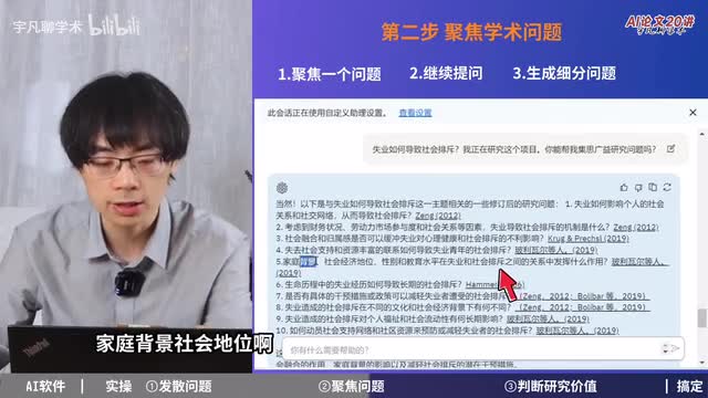 你想整个大方向是失业和心理健康,那么具体点可能就到了社会排斥这一点,对不对?我就可以聚焦在这一点,哎,很值得去研究吗?那好,那围绕这个问题啊,我的建议是你今天继续提问,你不要满足于这一点,你要让site给你提供更多的相关问题,让你把这个点给打开了。你想一想啊,如果你去写一篇论文啊,你不会只问一个问题的,对不对?你会问好几个相关问题,或者说唉这个问题可以分解成几个小问题,然后合起来才是一个完整的论文。所以在这种情况下,你的做研究才会有一个明确的阵地,明确的方向。那好,我们就围绕这个问题哈,失业和社会排斥的关系聚焦去接着提问。那么现在你可以看到,我现在把这个问题给复制过来啊,从之前的五十个问题中给复制出来,再继续来单独问他。