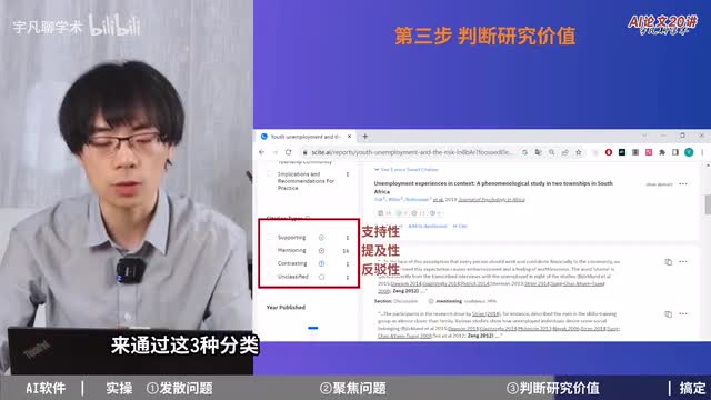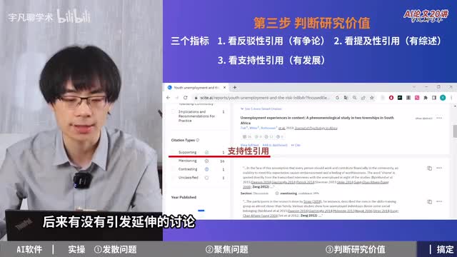 哎,比方说他这里已经给你分类好了,那我这里选择给你看哈。它这里有知识性的引用、反驳性的引用以及提及性的引用。所以它能够帮我们啊来通过这三种分类来判断这一种研究究竟值不值得做。所以我这里也会给你几个指标来判断。第一个指标你就是看这个文献啊有没有反驳性引用。