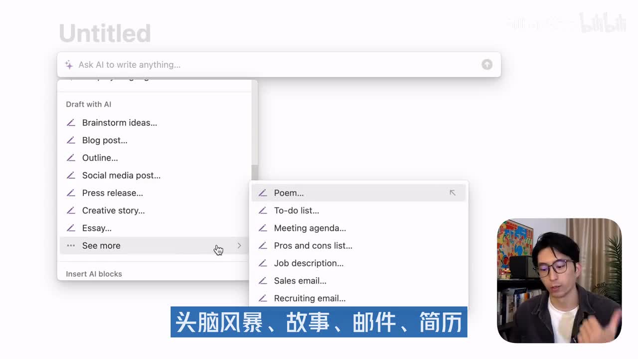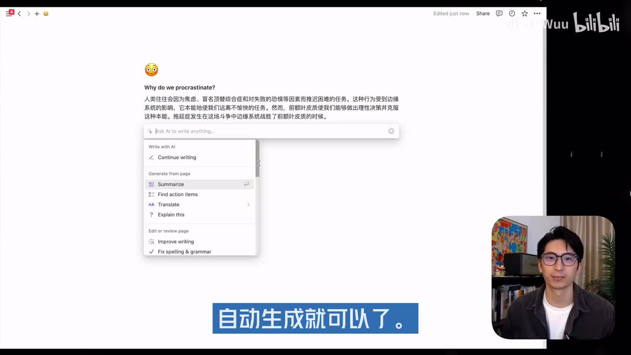 如果你想要把它翻译出来的话,同样的点击translate,然后选择相应的语言进行翻译就可以了。如果你需要重新起草一篇文本的话,只要点击空格,它就会自动弹出对应的功能,选择一个符合你的功能,自动生成就可以了。所以不得不说,notion ai在写作上面确实帮助我节省了很多的时间。基本上现在我需要写视频的文稿的时候,我都会通过它来辅助我去完成。最后呢是我的两个通用工具,基本上我在做视频的时候呢我都会用到。