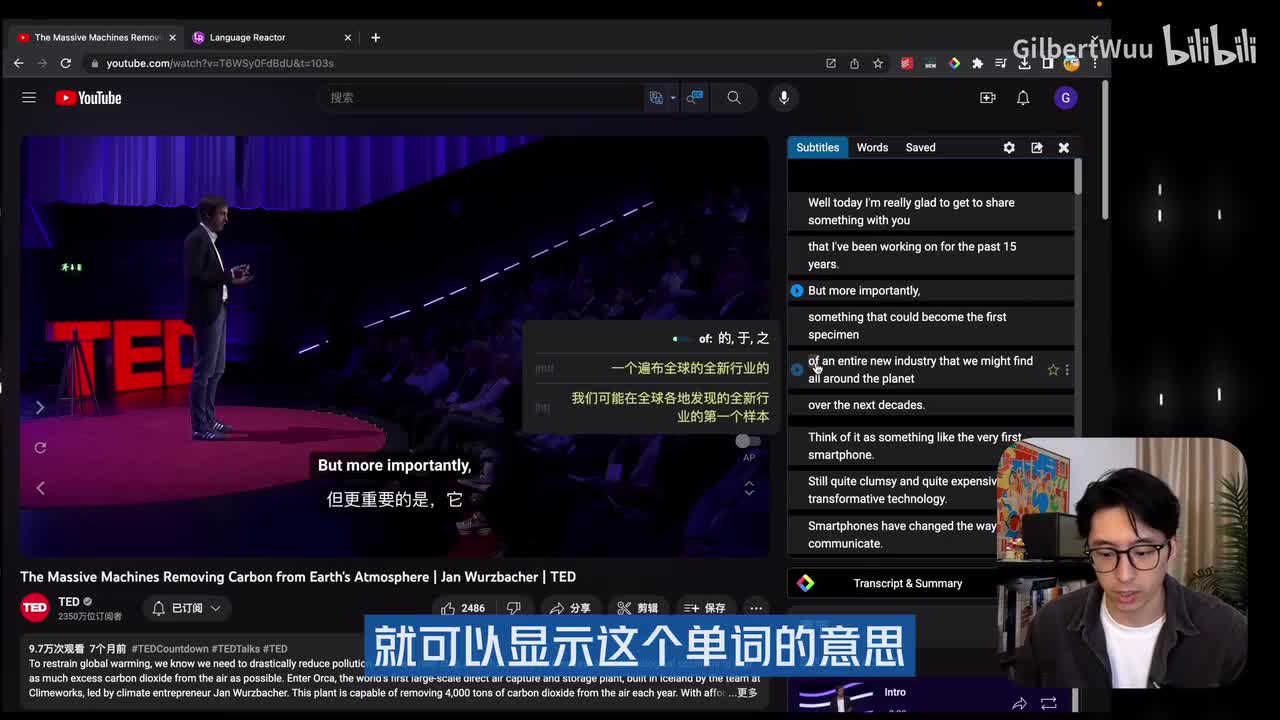 但如果你下载了这个插件之后,你会在这个页面看到有个开关的按钮。打开它之后,它就会变成中英文双语对照。右边看到这边视频的字幕,你可以点击相应的字幕,就会跳转到对应的时间点,鼠标移动到对应的单词,就可以显示这个单词的意思以及整句话的意思。这让我去理解这个视频的时候就变得更加简单了。其次是你会看到视频的左侧有几个按钮,点击重复就可以重读现在的句子,点击方向键就可以跳转到上一句或者下一句,再也不用鼠标来调整进度条了。