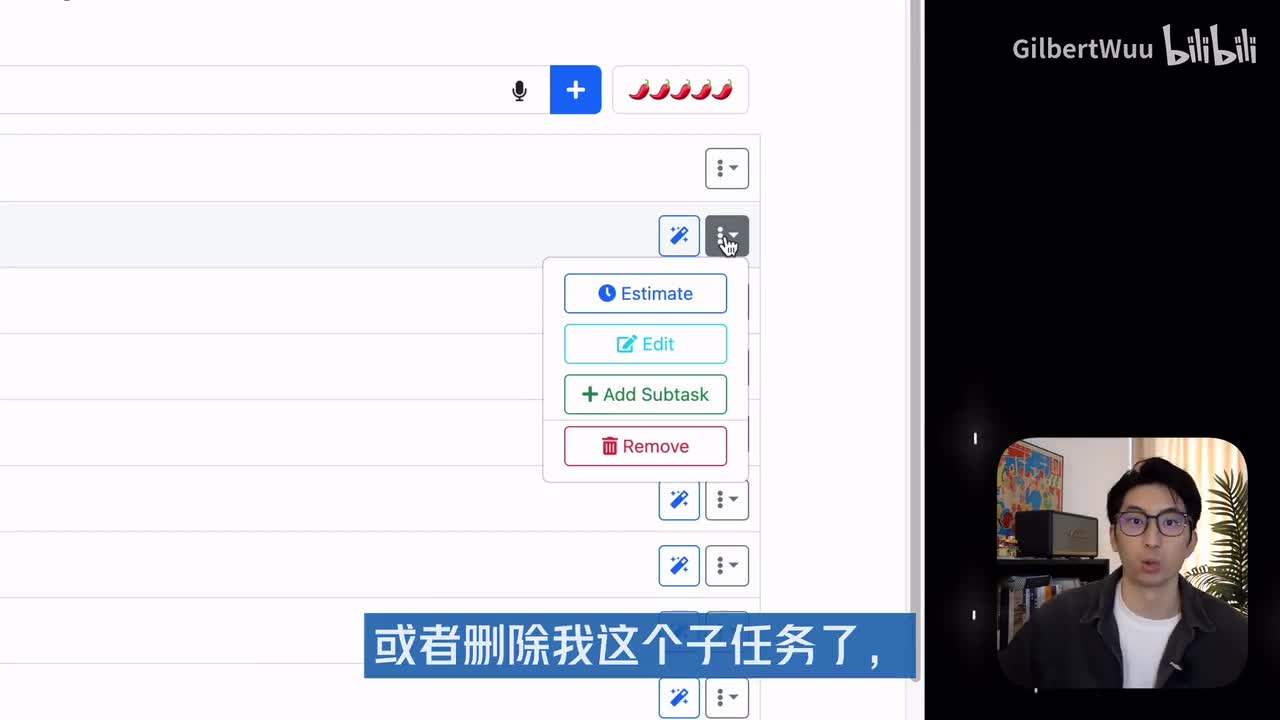 比如说现在我们把它拉到五个辣椒的位置,然后清除我原来的任务。重新点击魔法棒,你就会看到它会比之前的变得更加的详细。然后在右边你就可以看到有三个小点,在这里我就可以添加或者删除我这个子任务了,或者是点击estimate就可以预估我这个任务的完成时间,我就可以掌控我整个任务的大概的节奏了。在这里要注意,我一般的习惯是,当我罗列出所有的待办事项之后呢,我会把它添加到我的notion或者其他的一些笔记软件当中来。