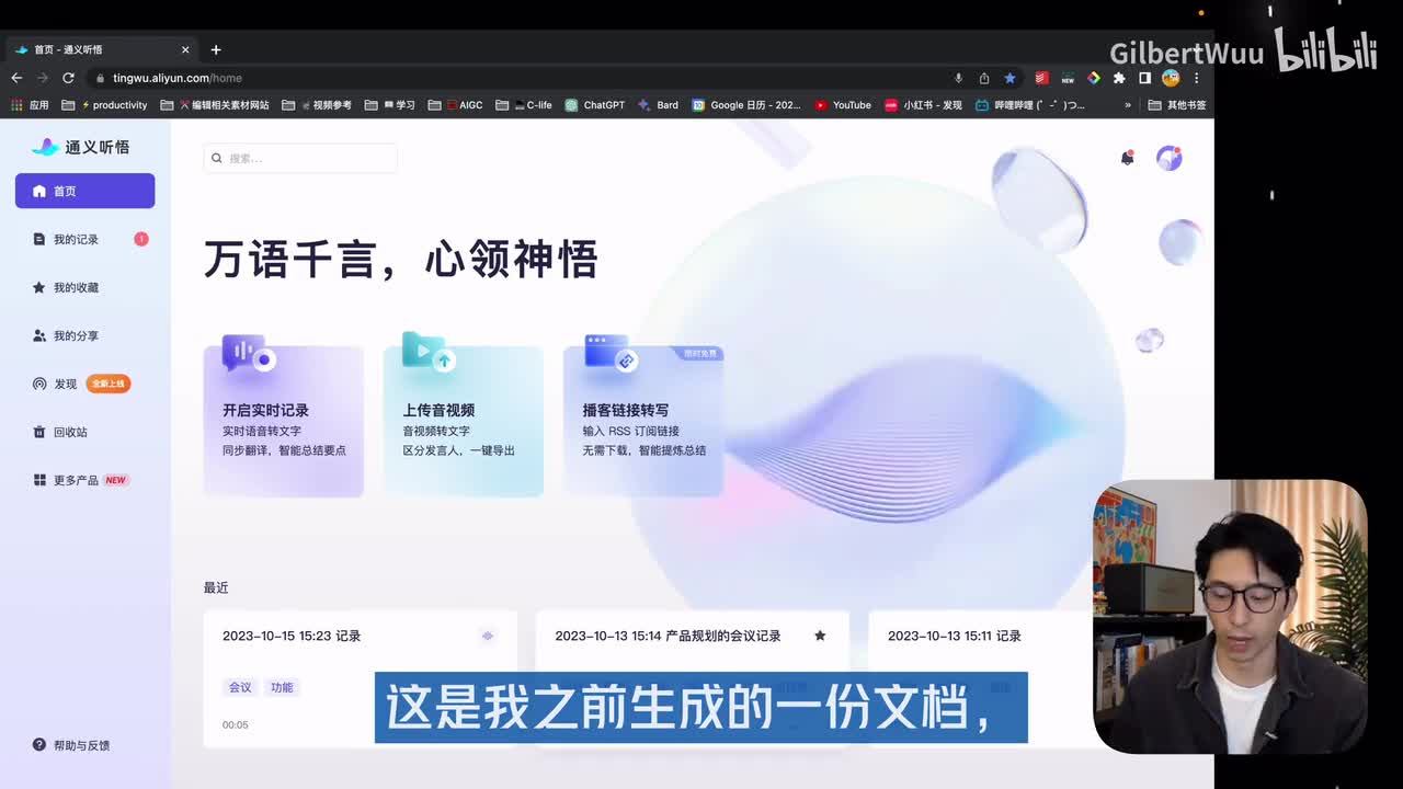 自从我在一个月之前发现它之后呢,我就开始慢慢去放些录音笔了。以往我在开一些中文的会议,或者在做一些访谈的时候,我都会打开录音笔或者是用手机来录音。结束之后呢,上传到电脑,然后经过一系列的步骤生成文本。然后这里操作一下,变成一个会议纪要,变成一个总结,整个效率还是蛮低的。后来我才发现通义听悟的实时记录以及语音转文字的功能还是蛮好用的。