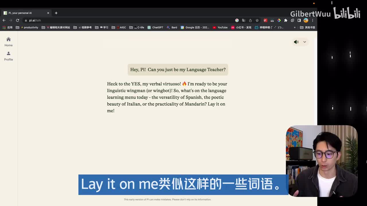 比如。嘿派,请问你能够当我的语言老师吗?你看这是他的回答,你会发现他的回答还是蛮有个性的,在话语间仿佛能够感觉到他表达的情绪是什么样子的。包括他用的一些情绪语音语调的一些词语,比如说类似这样的一些词语,让我们继续。你会发现他每次回答之后呢,最后都会永远伴随着一个问题,让你跟随着他们的问题一直追问下去,几乎无止境的去对话。所以这种真人感很足的对话,让我感觉到我的电脑背后是不是真的藏了一个人在后面。