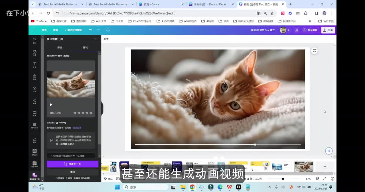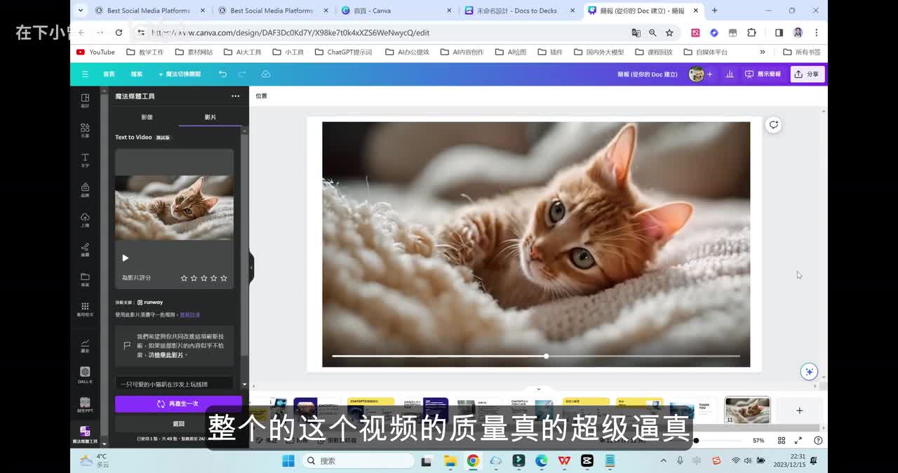 我们也可以来看一下哈,同样的输入一个猫猫趴在沙发上玩线的,我们来看一下它的这个效果,可能要稍等一分钟的时间。哇哦我觉得这个效果真的太棒了。整个的这个视频的质量真的超级逼真,而且效果也非常不错。那大家下来呢可以自己去玩一玩。那整个p p t完成之后呢,我们可以点击右上角这里的分享。