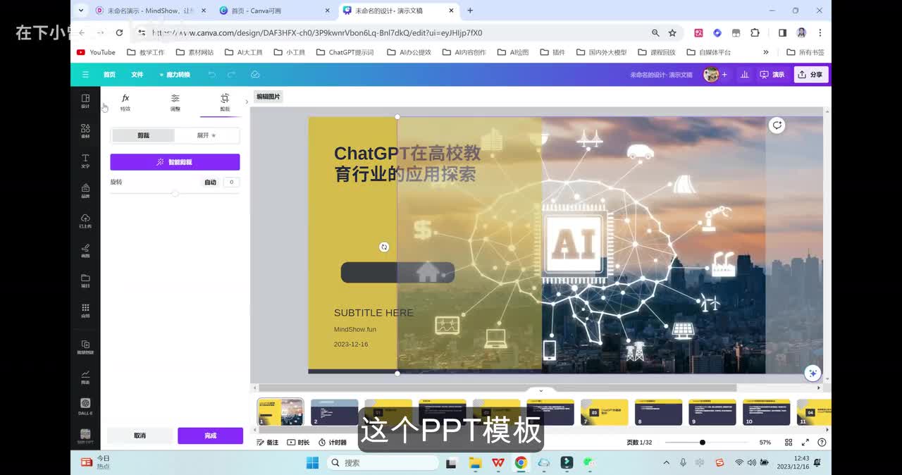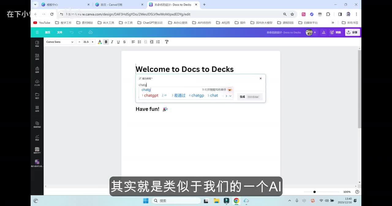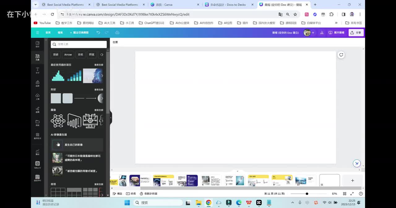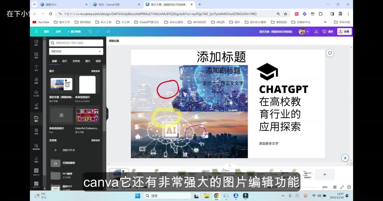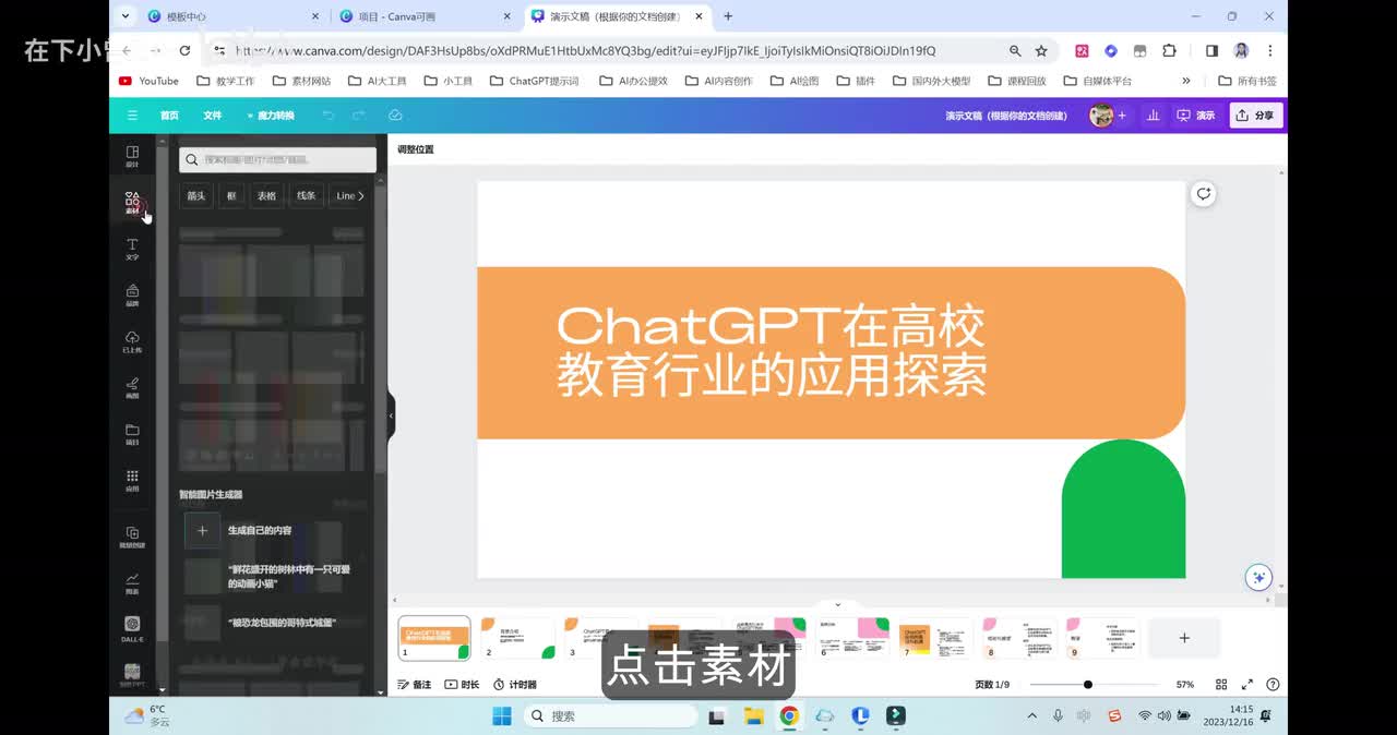 但是有一个最大的优点就是什么呢?它目前文本生成p p t的次数是免费的,是不限的那我们这个地方可以先暂选一个模板,进来之后呢,大家可以看到它的这个界面功能按钮主要是集中在最左边这一块,分为了设计素材、文字啊,包括下面的画图以及项目等等功能。好,那我们进来之后可以看到里面的内容和文本是完全能够对应上的。但是总体来讲呢,模板的设计不是特别的精美,还是简单了一点。这个地方呢Canva 就有一个非常智能的点了ai布局助手。