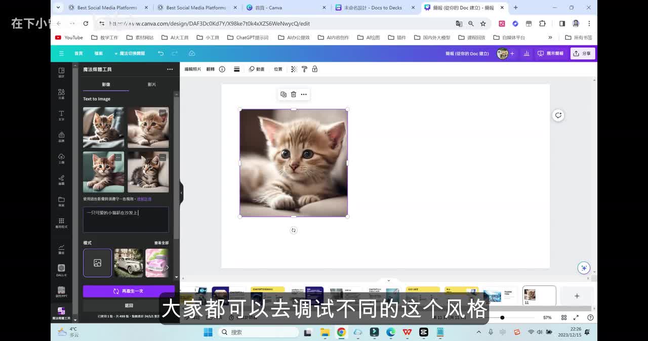 包括我们也可以去上传自己的一个字体包。那这个地方的一个画图工具呢,我们可以自己任意的去发挥自己的想象。在这个弹幕呢就是我们的一个历史记录,包括像我们自己建立的一些文件夹,它方便我们的一个图层管理。除此之外呢,Canva 它还有非常强大的图片编辑功能。我们选择一张图片拖进来,可以在这里呢点击编辑进来之后,我们可以看到有三个功能啊,重点要讲到特效按钮下面的ai魔力工作室,它可以一键抠图,一键换图,并且呢可以对我们的图片进行分层。