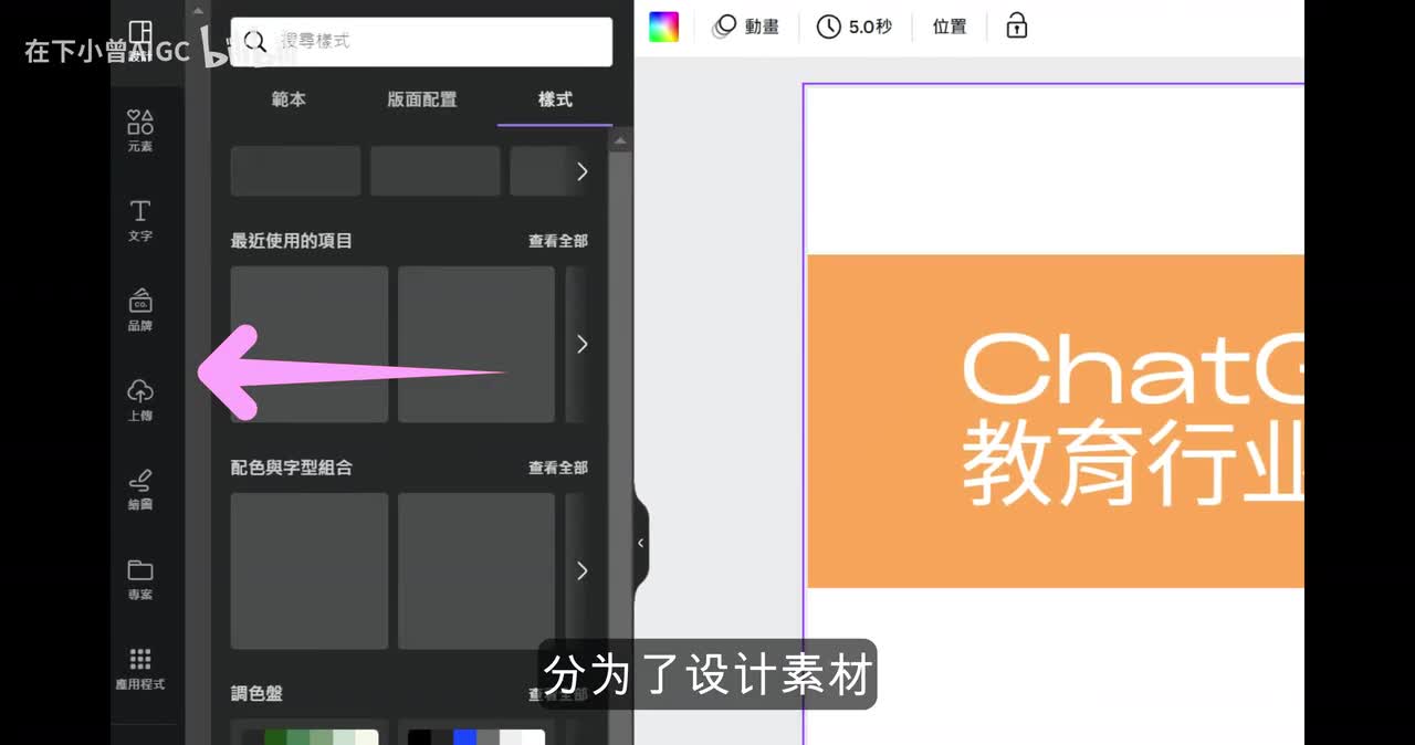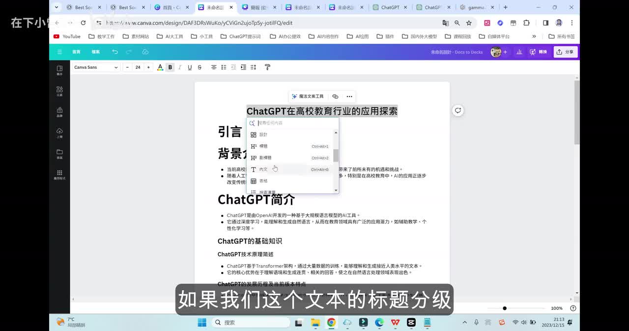 导入进我们的Canva 里面呢,我们可以对它的这个模板去进行一个调整。在我们的这个设计功能按钮这个地方的布局,我们可以去选择系统自动匹配的。这样一来我们就可以把已经做好的这个p p t模板载入到Canva 里面去进行一些润色。在文字这个地方呢,大家可以去选择到相应。但是它这个地方根据我们的大标题、副标题以及正文去进行了分级。