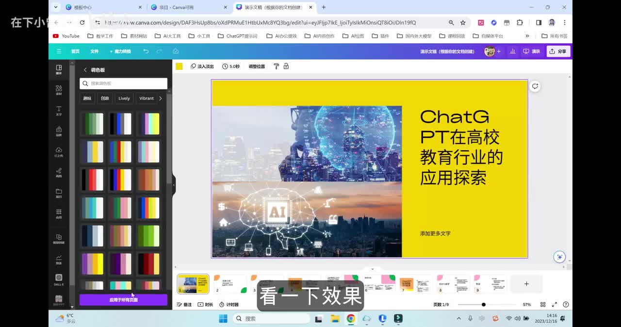 这个时候我们再返回配置页面,大家就可以看到它这地方有非常多智能推荐的模板了。那包括像在样式这个地方,点开它还有一键智能修改页面色系的一个按钮。我们点击这个地方的随机配色看一下效果,然后也可以将这个呢应用到全部模板当中,就可以实现一键换颜色的这个功能了。当然我们也可以选择一个自己喜欢的模板,然后呢采用它的这一套色彩这个地方的一键匹配。很快的我们p p t里面的颜色呢它就做了一个智能的更换。