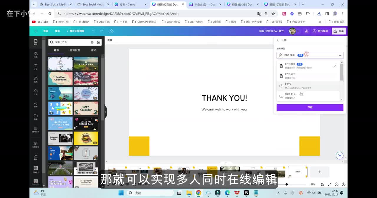 当然如果你是企业团队合作或者是学生的小组作业的话,我要向各位隆重推荐这个功能,多人在线合作。我们只需要一键分享自己的设计链接,那就可以实现多人同时在线编辑的这样一个功能了。这个地方支持多种文件格式的导出,图片、视频pd。f等等格式都是支持的。我们这个地方选择p p t x格式啊,点击下载稍等一分钟的时间。