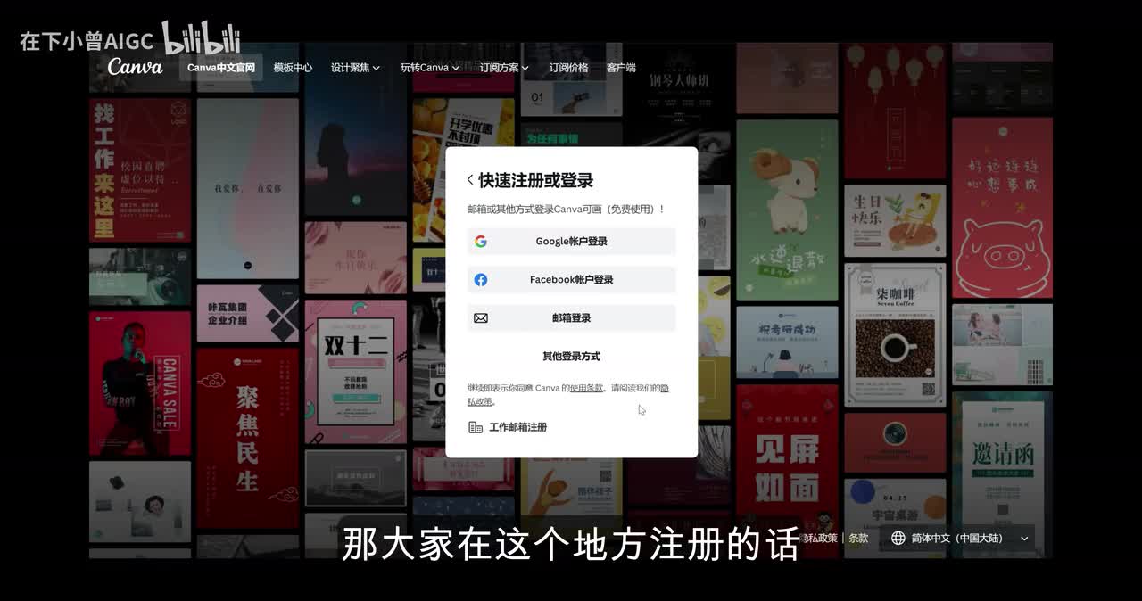那Canva 呢它拥有海量的图片库和精美的模板,在这个地方应有尽有。点击可画的首页,我也会直接将这个网址放在简介区里面,大家自取。那大家在这个地方注册的。话可以选择用谷歌账户或者是其他的邮箱方式,我们点击登录就可以了。好的,接下来我们点击这个地方的范本。