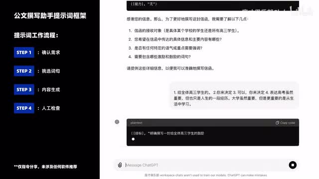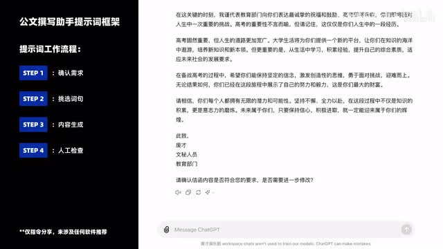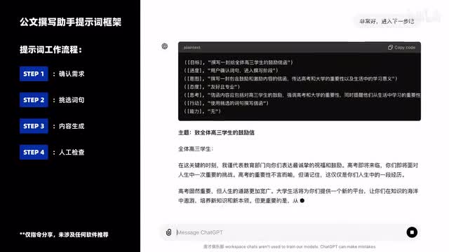 接下来让我们来看一下演示效果,将这套提示词输入给a i当然,你可以选择国内其他的ai大语言模型。接收到提示词后,ai会询问我需要撰写哪种类型的公文,并了解具体的内容和要求。然后我告诉他,我希望撰写一封鼓励高三学生在即将到来的高考中加油打气的信函,给予他们信心和力量。