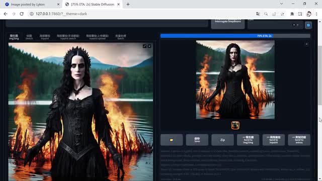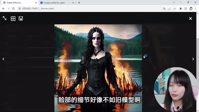 base模型是基于text to image训练的,纹身图是它的强项。我们看一下这个水面波纹、这个火焰,还有这个火焰倒影,还有背后的虚化。可能有朋友会说脸部的细节好像不如旧模型啊,没有旧模型好看,这个只是底模还没有进行很多的风格化训练,ai还不知道你认为好看的脸是怎么样的?再说了,这不还有refined模型吗?我们点击图生图按钮。切换成refined模型。