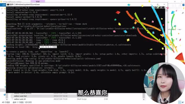 搞定以后我们就可以打开web user点b a t。第一次启动它是需要下载一些文件,直到出现这个网址。那么恭喜你,你将可以在web u i使用最强的s e s l模型了。我们把这个网址复制下来,不要关闭窗口。