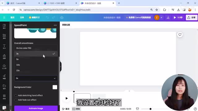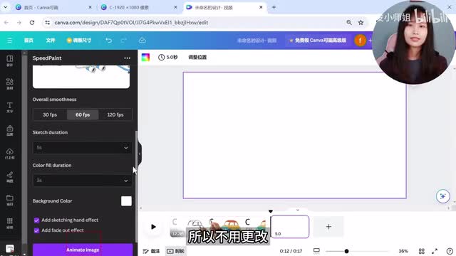 当然如果你的图像是黑白的,没有其他颜色,那么可以选择第一个选项,low color feel, 没有颜色填充。我设置为三秒好了。背景颜色我选择白色。sketching and effect手绘效果是指手部绘图动画。