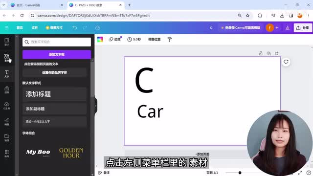 中间是我们要创建内容的画布面板。右侧上方是分享和下载。接下来我想制作一个关于首字母学英文单词的儿童教学视频。点击左侧文字选项中的添加一个文本标题,我们学习交通工具。