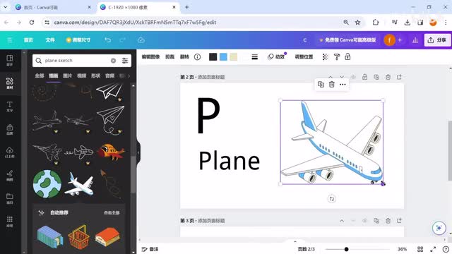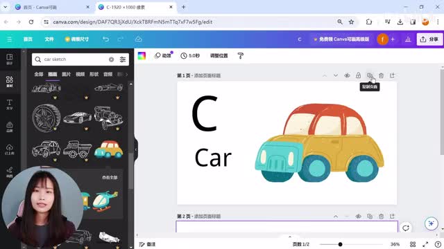 我选择一个彩色的小汽车,单击就添加到画布,调整大小和位置。编辑完成可以点下方的添加页面按钮,但是一般我们为了各种素材位置相对一致,建议大家复制页面。点击画布右上方的复制页面滚轮往下来到第二页进行编辑,字母我更改为p单词play飞机。单击小汽车。