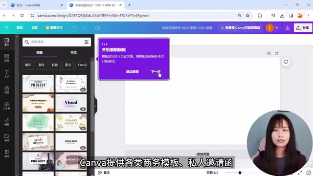 点击创建新设计。页面自动跳转到编辑面板。开发提供各类商务模板、私人邀请函。最左侧是菜单栏和对应素材库。