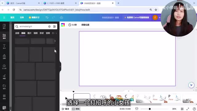 当然完整的动画呢还需要一个开头,滚动条拉到最前方,右击选择添加页面,把空白页面放置在最前方。在左侧素材菜单栏里搜索animated girl动画女孩,查看全部,选择一个打招呼的小女孩作为我们的视频开头。调整好位置,接着在文字菜单栏里选择一款字体组合。改为little friends。