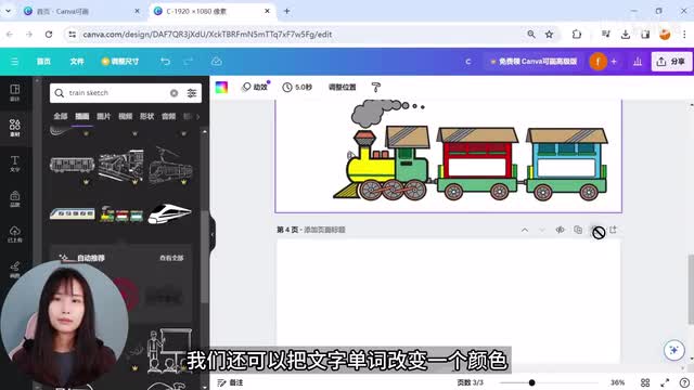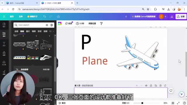 点击删除键,调整好单词对齐,在素材搜索栏输入plane sketch,选择这个小飞机号了。调整好,同样复制页面,按相同的步骤制作。第三页小火车。当然,文字和图片布局可以自定义。