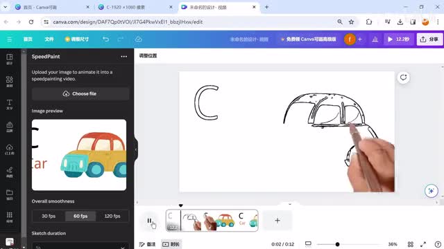 完成下载。回到canvas画布编辑面板,点击最上方的文件选项,创建新设计视频,等待页面自动跳转到视频编辑面板。点击左侧菜单栏的最后一项应用,然后在搜索栏里输入speed pid单击可以查看这个应用的介绍。它可以把任意图片转换成一个速度绘图的视频,也就是我们的白板动画。